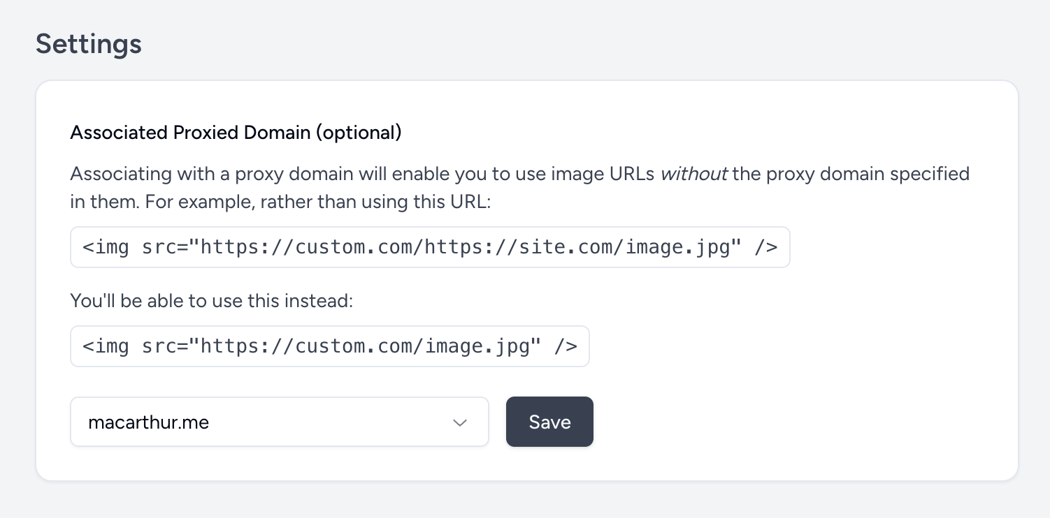 To simplify the URL even further, you can optionally hide the fact that the image is being proxied by associating your custom domain with one of your registered proxied domains on your account. When this association is made, you’ll be able to use this URL instead: